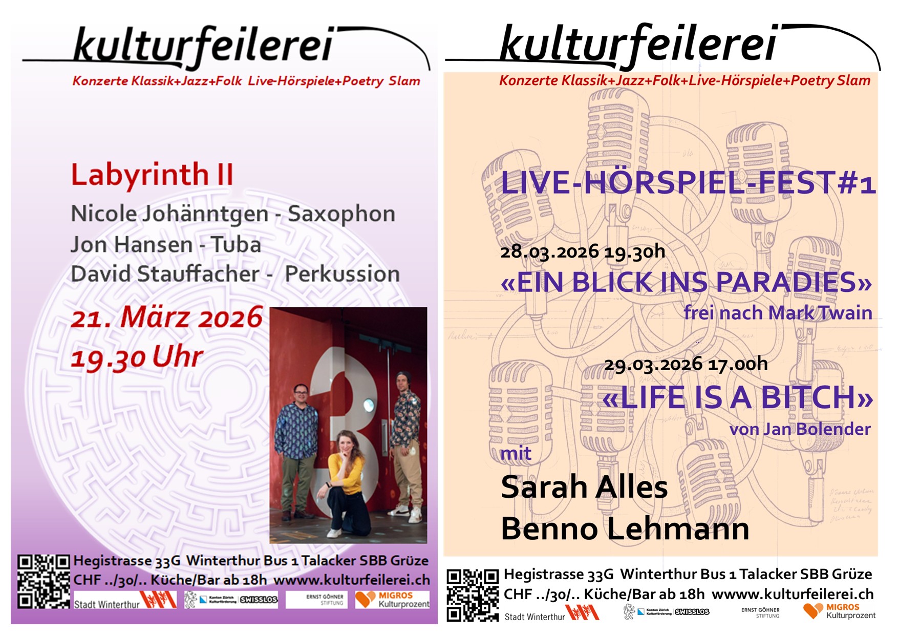 Hier entsteht ein vielseitiges Programm: Jazz, Klassik, Folk und Experimentelles – begleitet von poetischen Abenden, Live-Hörspielen, Lesungen und Kursen. Künstler:innen aus Winterthur, der Schweiz und darüber hinaus bringen ihr Schaffen einem offenen Publikum nahe. Ziel ist gelebte kulturelle Teilhabe und echter Austausch. Die Kulturfeilerei versteht sich als lebendiger Begegnungsraum: ein Ort, an dem Menschen einander zuhören, gemeinsam gestalten und Kultur im besten Sinn weiterfeilen.